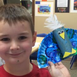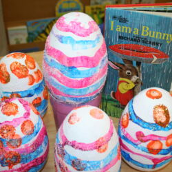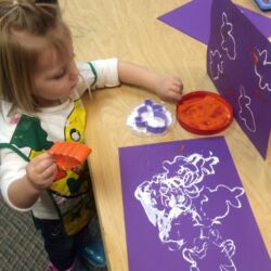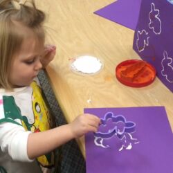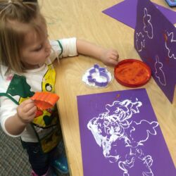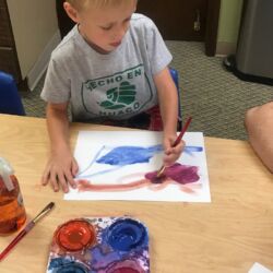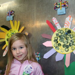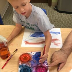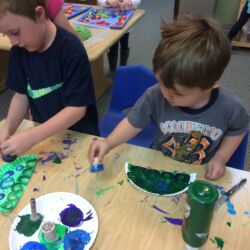First Steps pre-school art program meets once weekly for 1 ½ hours and is designed for ages 2 ½ – 5 years. During this time a routine is followed to help our youngest artists feel comfortable and know what to expect. Former Wichita Collegiate Great Beginnings’ teacher and artist, Kate Pepper, developed the First Steps curriculum. Kate’s carefully designed lesson plans are thematic units of study that follow weather, holidays, seasons and animal studies. For instance, a typical fall thematic unit would include Native American projects, pumpkins, leaves, harvest and a friendly scarecrow. Our youngest artists have fun experimenting with different media while improving hand-eye coordination, pencil grip, problem solving, sequencing and following directions.