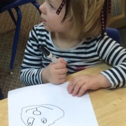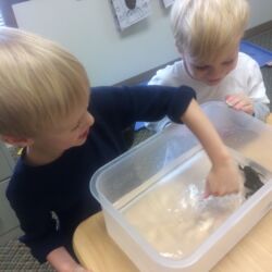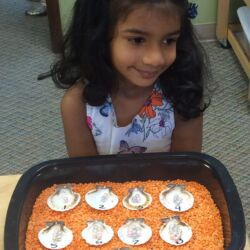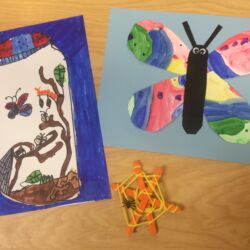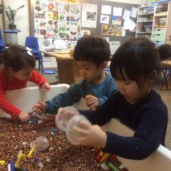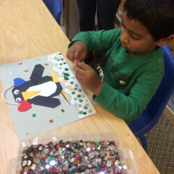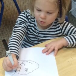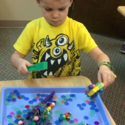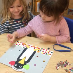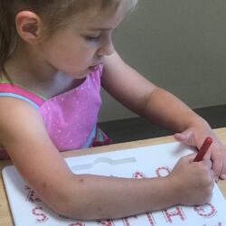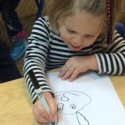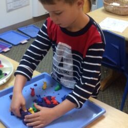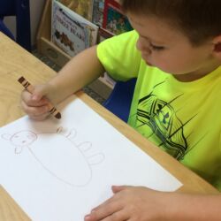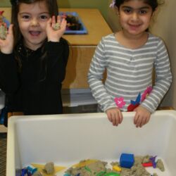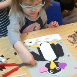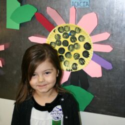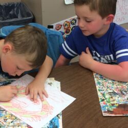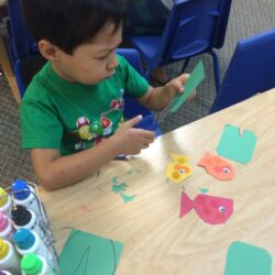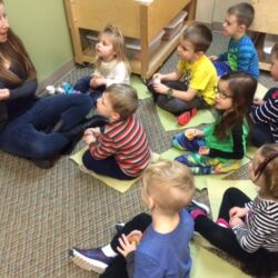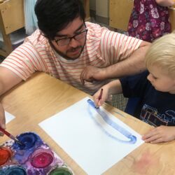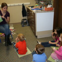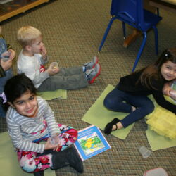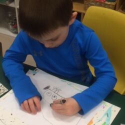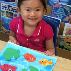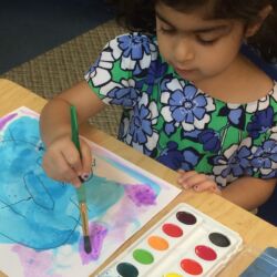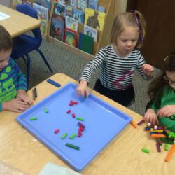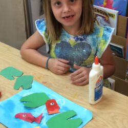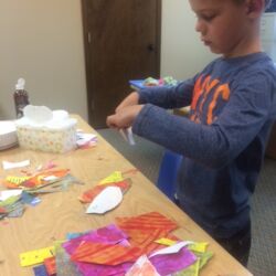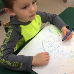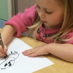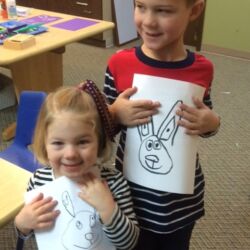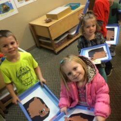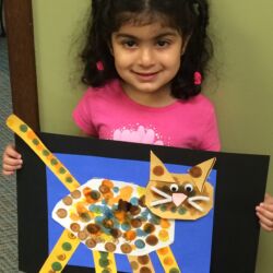 Upon entering our room, children will have center time, which may involve the sensory table, play dough, puzzles, matching and sorting games and imaginative block play. After center time children are called to group time and listen to a book that correlates to the thematic unit of study. Children also enjoy finger-plays, songs, games and a snack during group time (Each child needs to bring 2 boxes of whole grain, nut free crackers for each semester for snack. Our favorites include: Teddy Grahams, Goldfish, Pretzel Sticks, and Cheezits) After group time, children work on a tracing/coloring worksheet, participate in a “mini Monart” guided drawing lesson and cut and glue (collage) the subject of the day. We create at least three works of art each week!